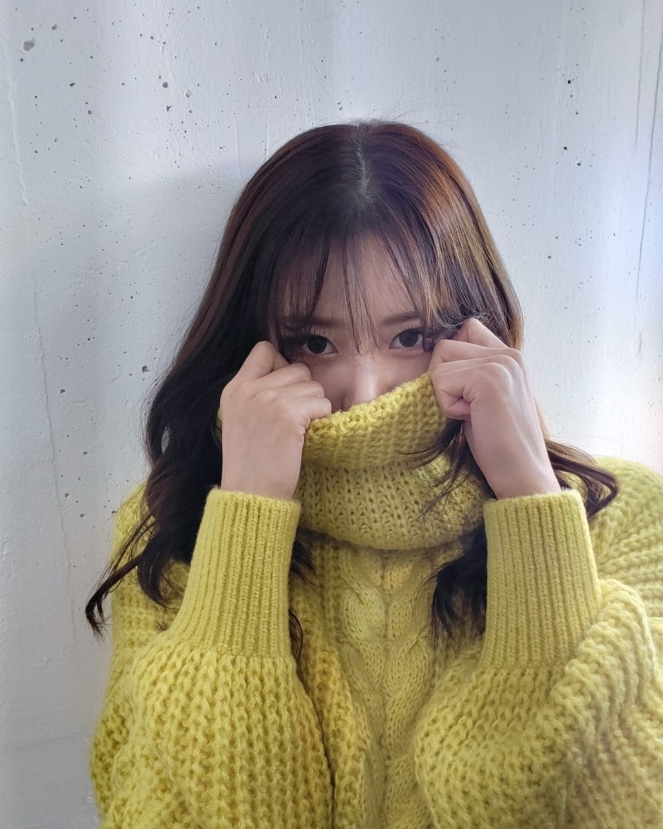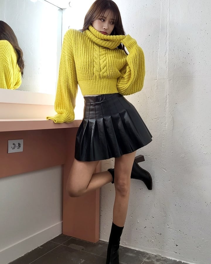 이미주는 노란색 골지니트와 블랙 미니스커트를 입으며 날렵한 각선미를 뽐내었다.
