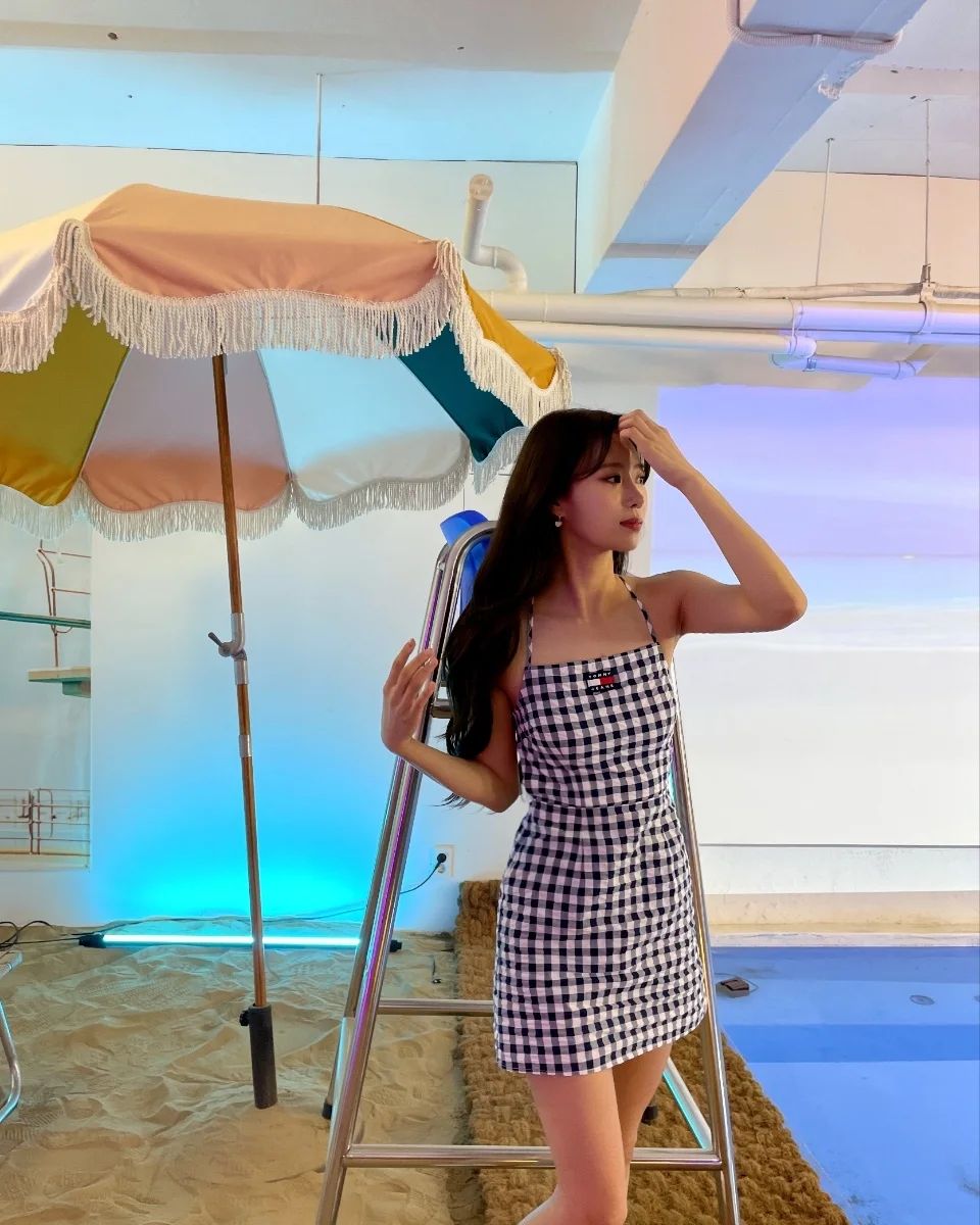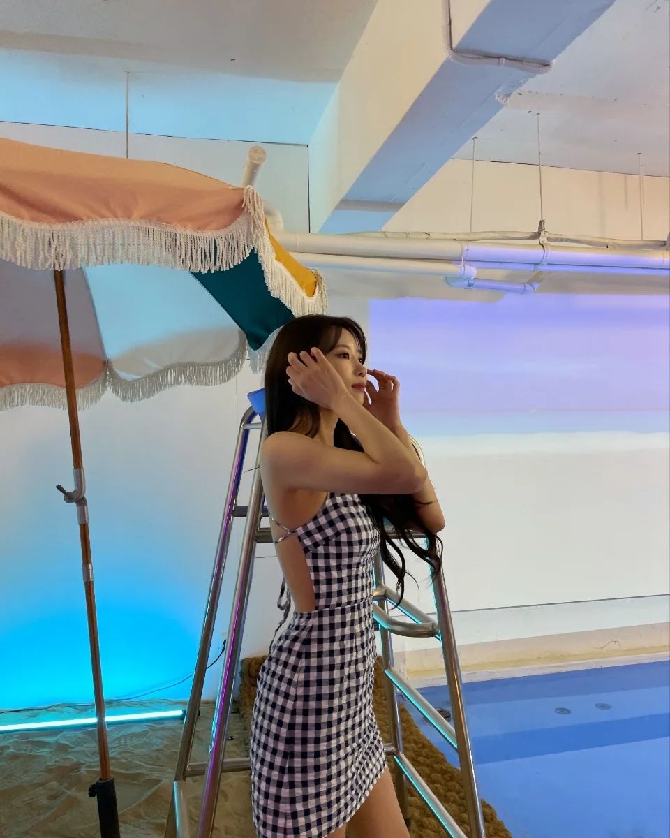 여름 해변 컨셉의 화보 촬영으로 보이는 촬영장에서 이미주는 등이 노출된 원피스를 공개하였다.