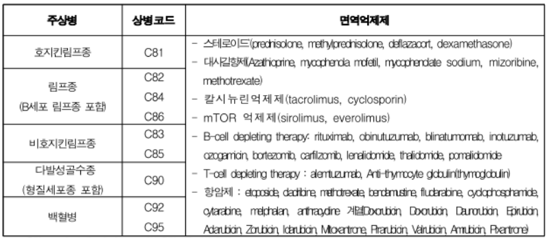 (1) 호지킨림프종, 림프종(B세포림프종 포함), 비호지킨림프종, 다발성골수종(형질세포종 포함), 급성백혈병으로 진단받고 이부실드 투약 예정일 기준, 최근 2개월 이내 면역억제제 치료를 받았거나 받고 있는 환자