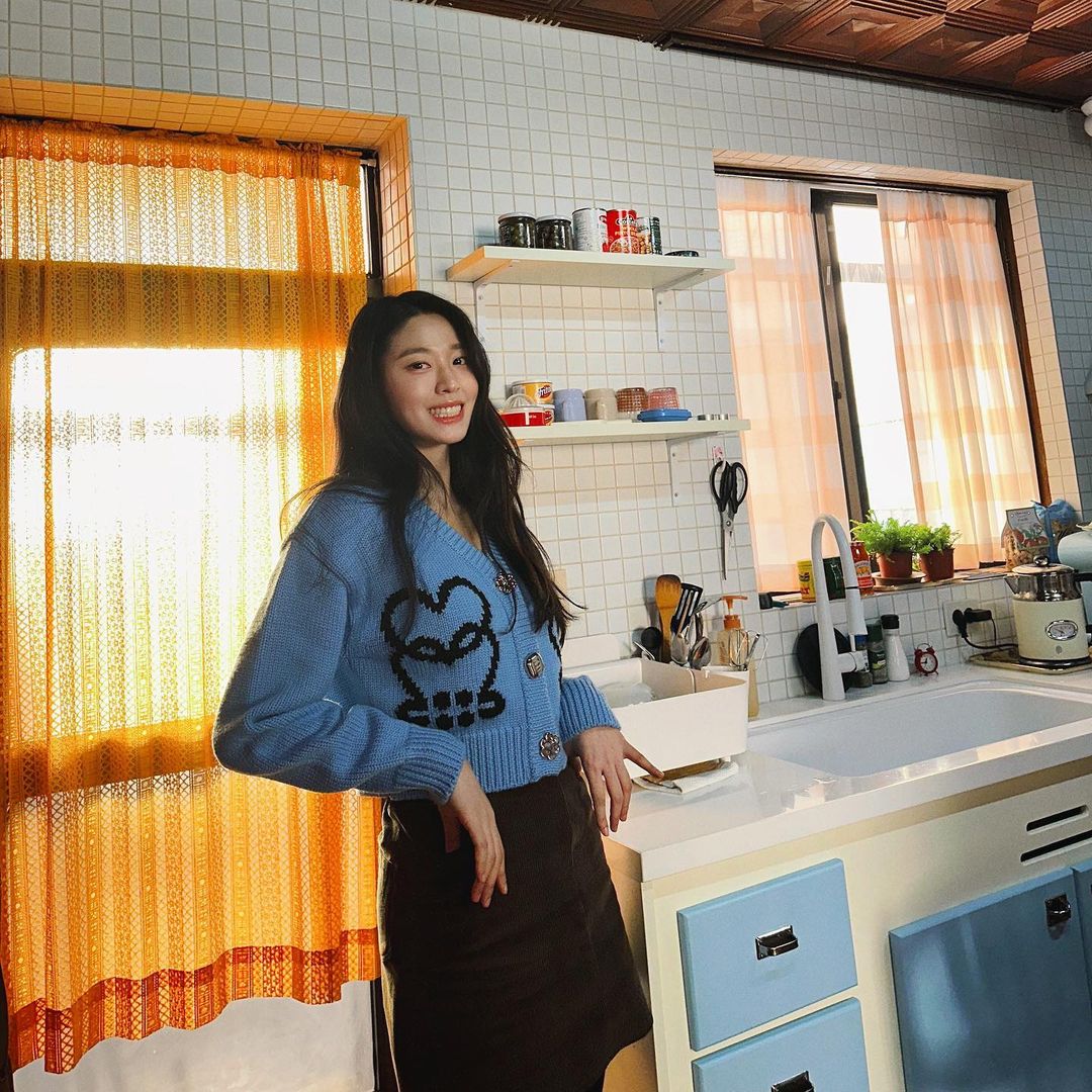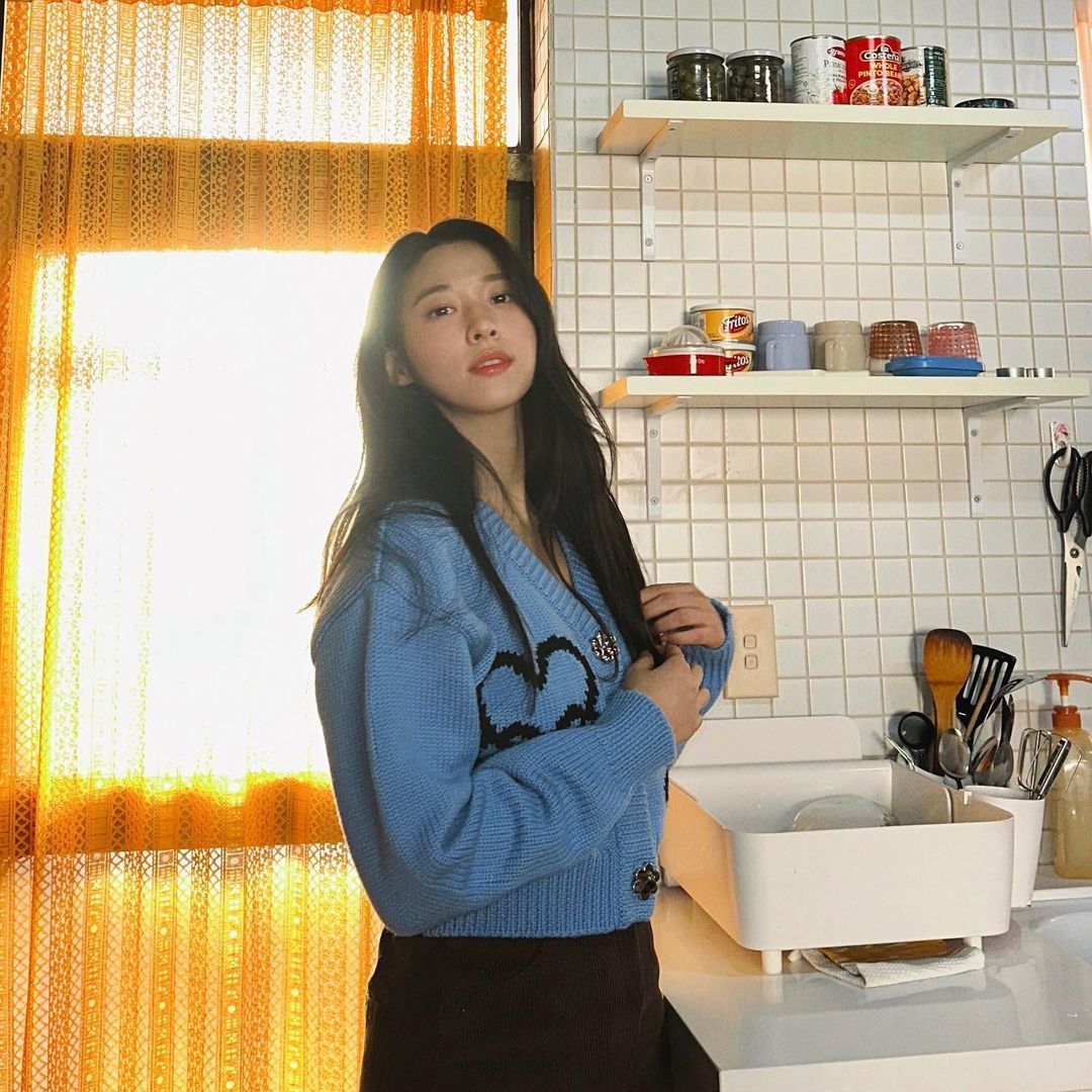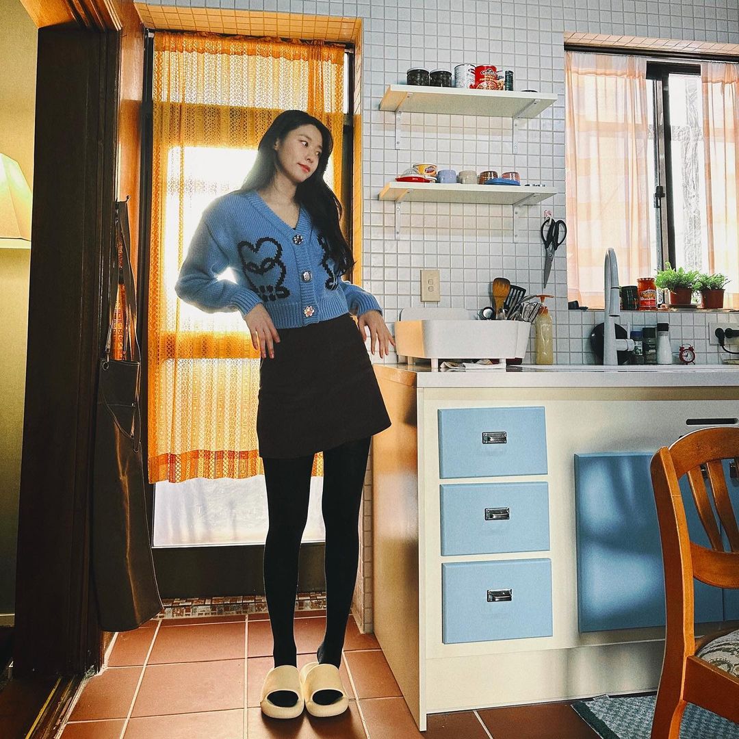 김설현은 하늘색 가디건에 블랙 단치마, 그리고 블랙 스타킹 또는 블랙타이즈로 패션을 끝을 장식하였다.