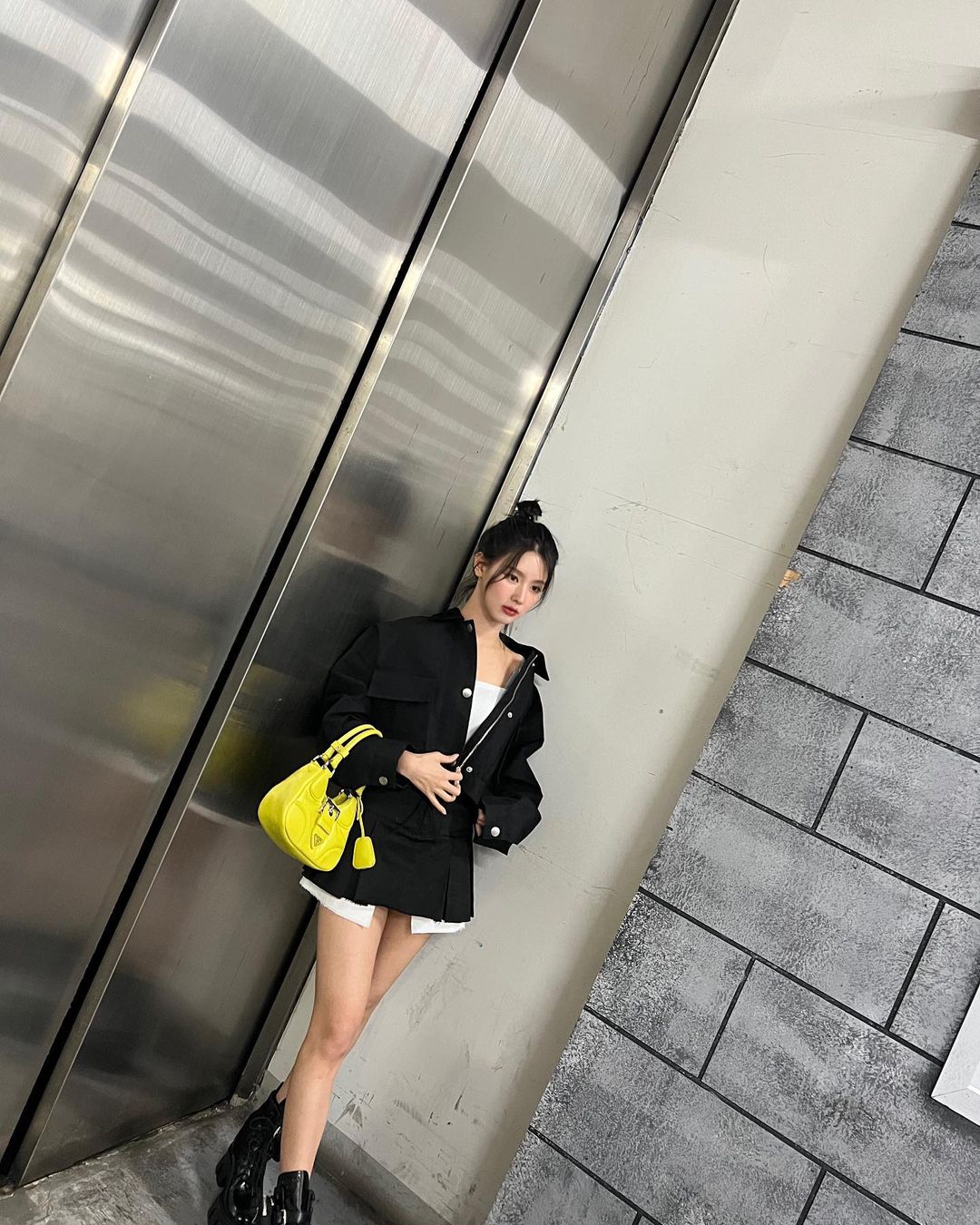 미연은 블랙 자켓에 숏 블랙 치마로 코디를 하였으며, 안에는 화이트 계열로 깔끔하게 패션을 선보였다. 여기에다가 프라다몬 백으로 포인트를 주었다.