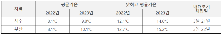 * 제주와 부산의 2월 중순에서 3월 중순 기간 동안 2022년 및 2023년 평균기온 비교