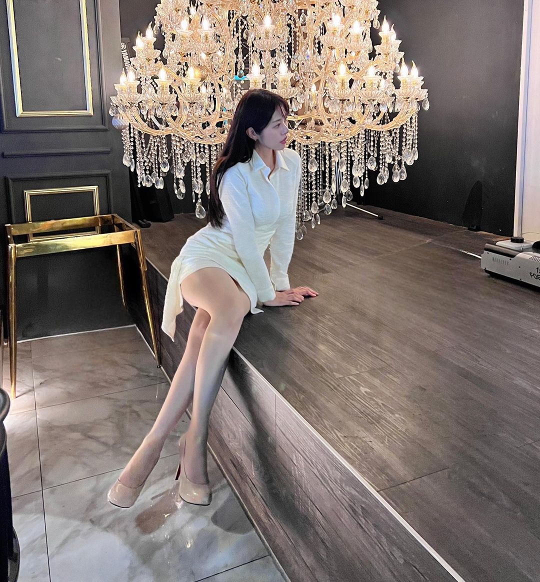 하얀색 화이트 원피스를 입은 서동주과 대형 샹들리에를 배경삼아 미친 각선미를 뽐내고 있다.