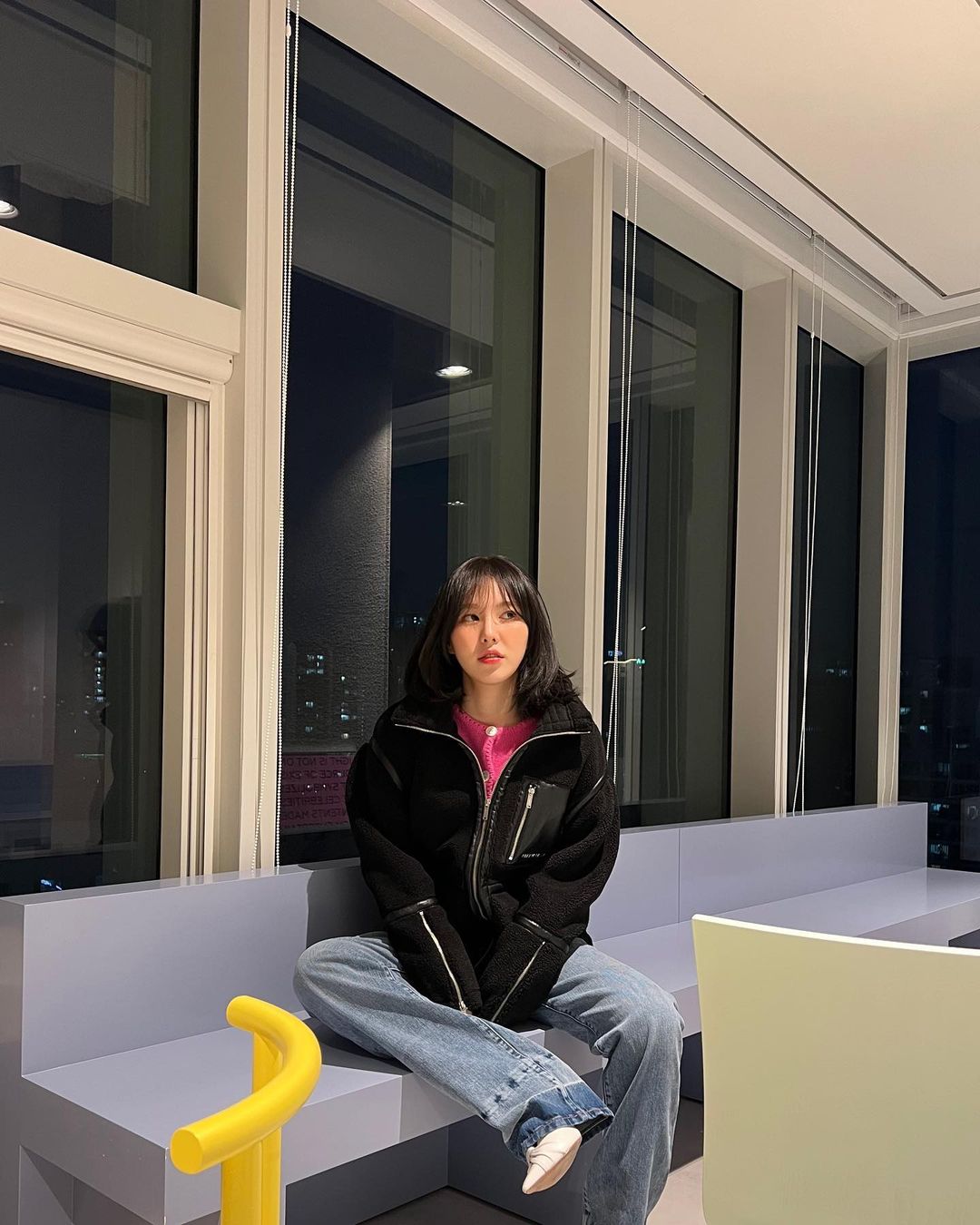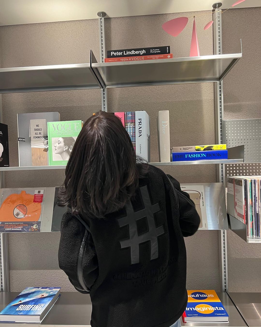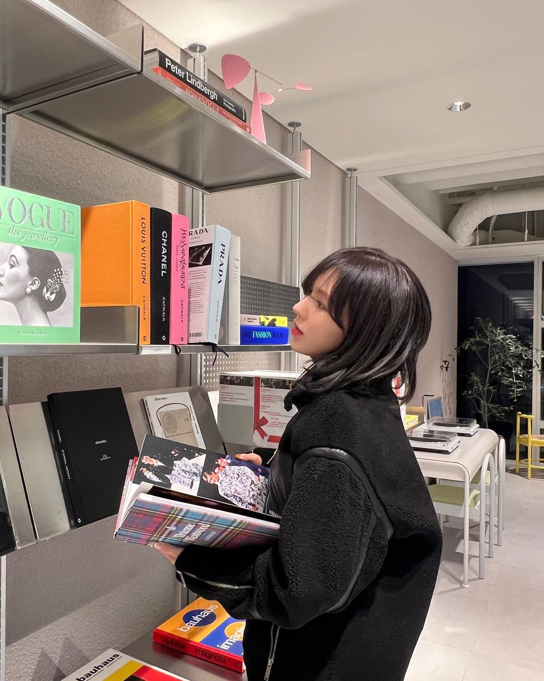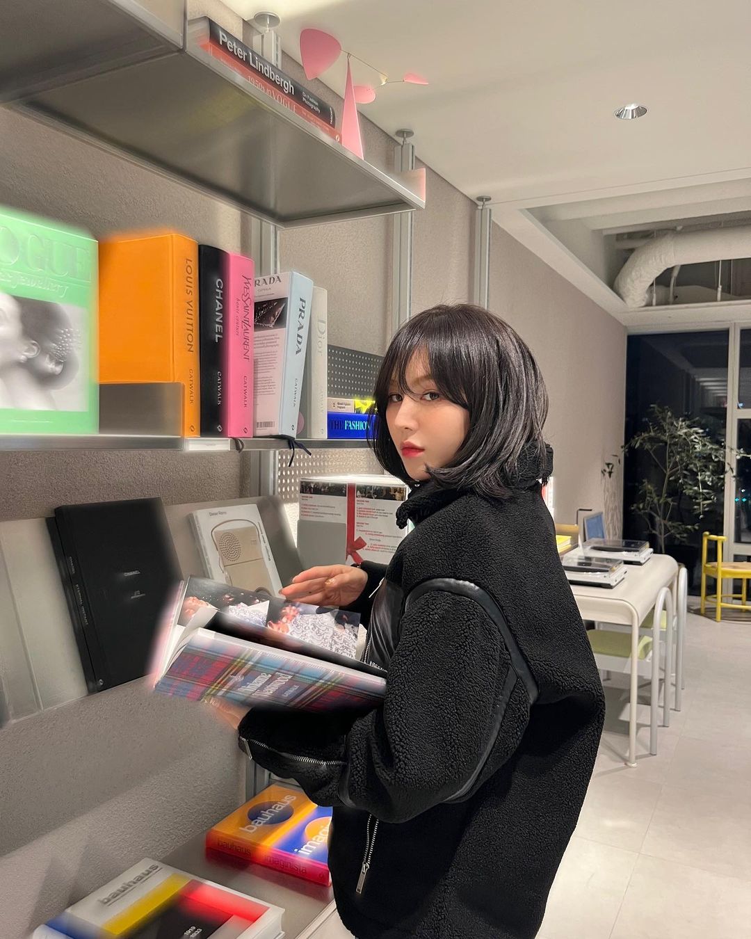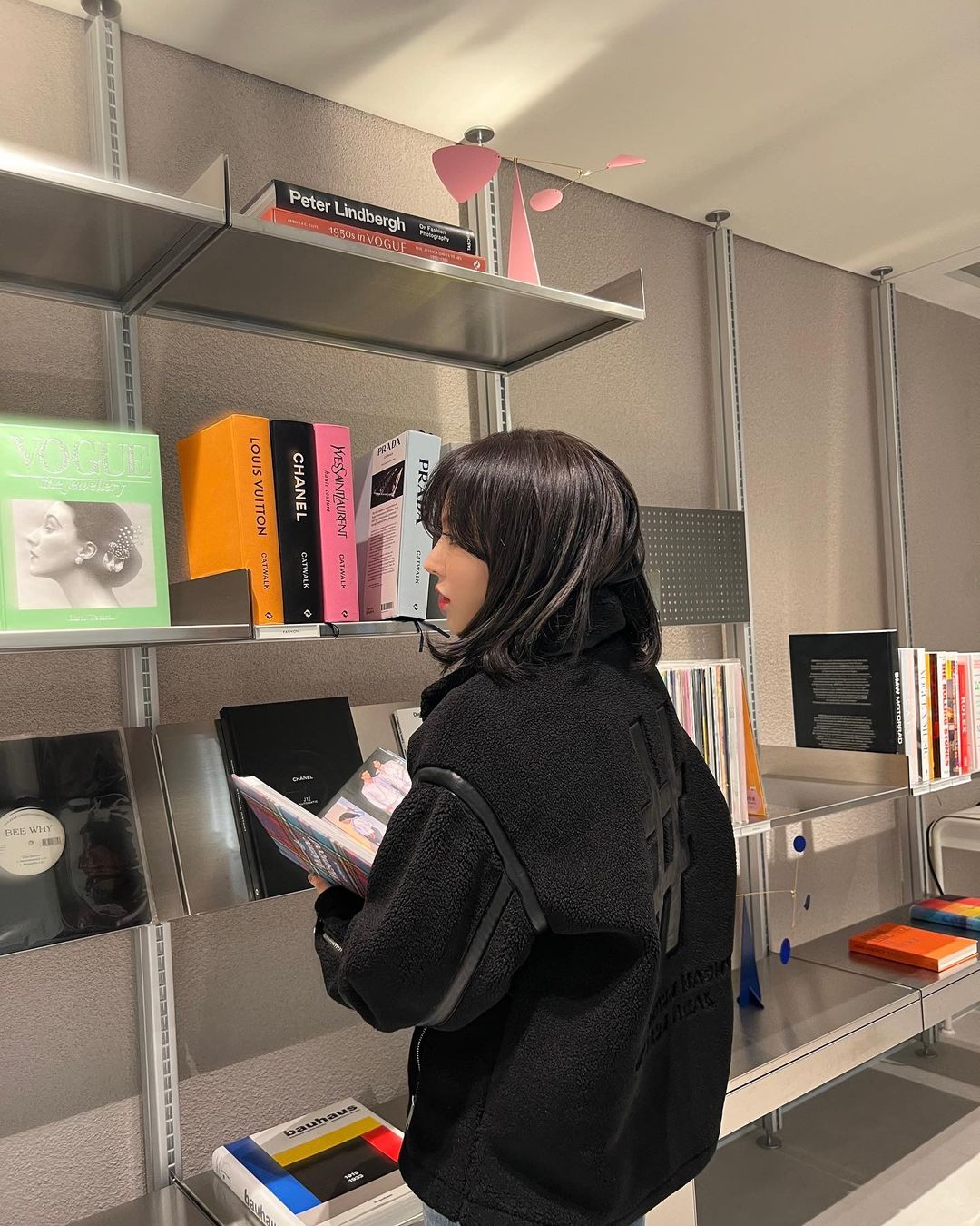 검은색 짚업티에 패션에 관한 공부를 하고 있는 듯한 웬디