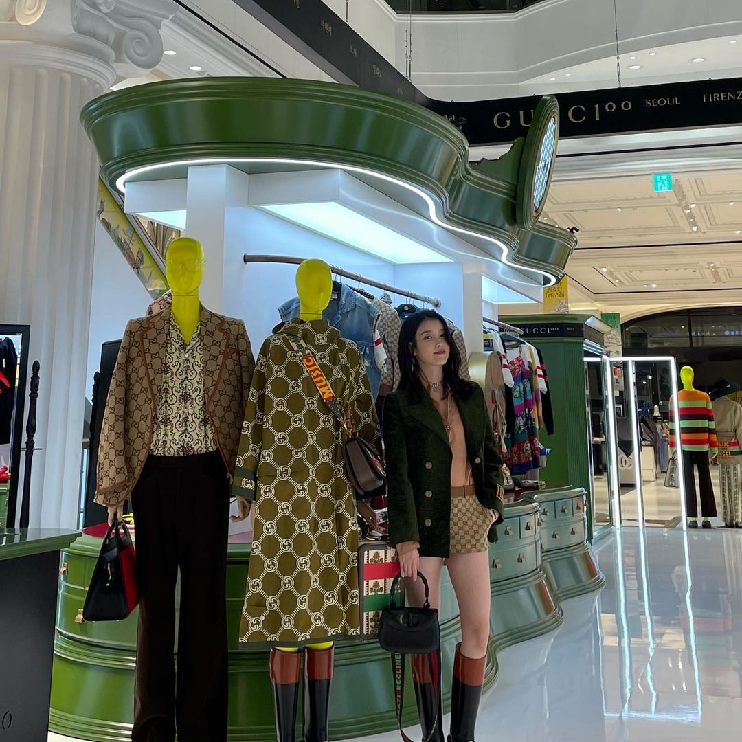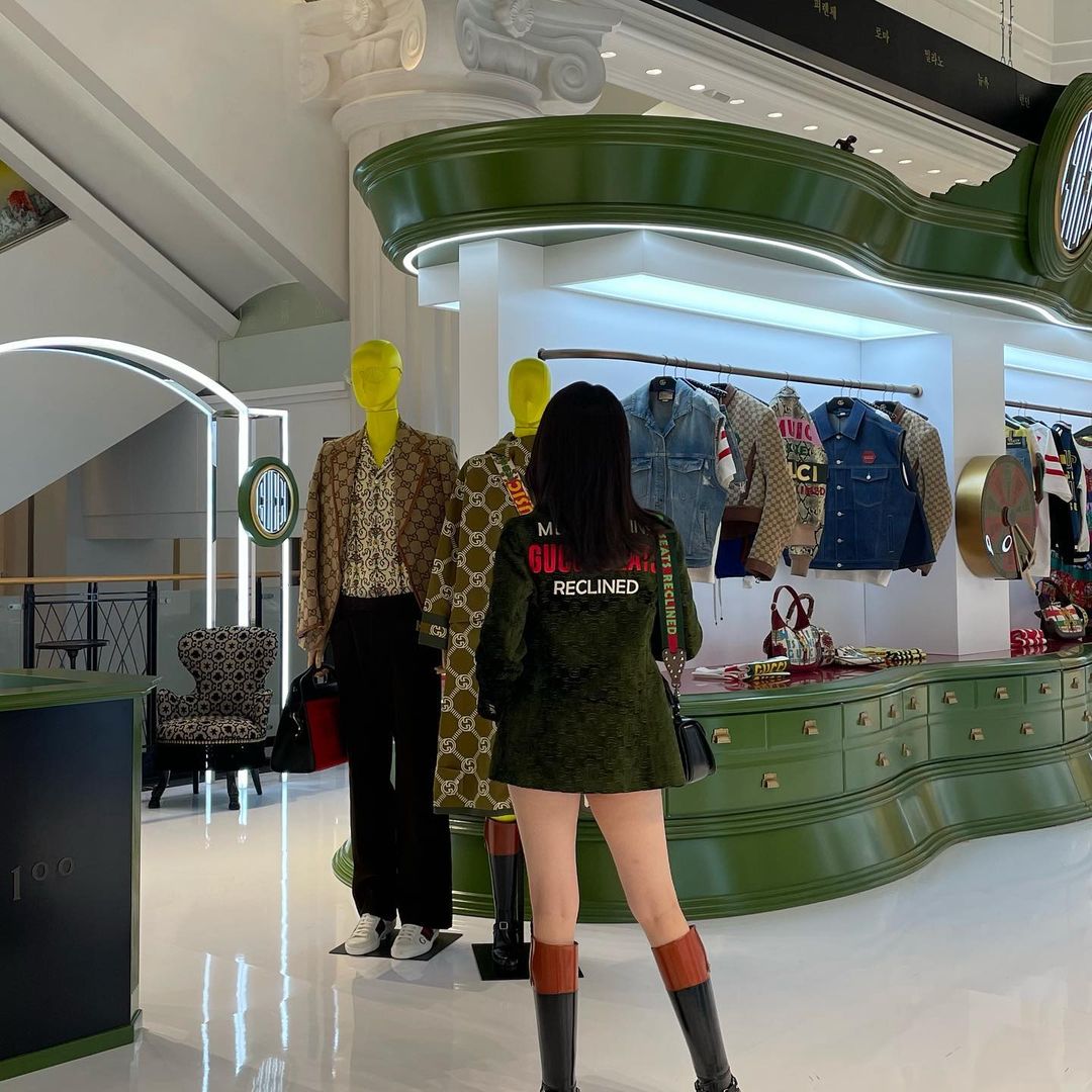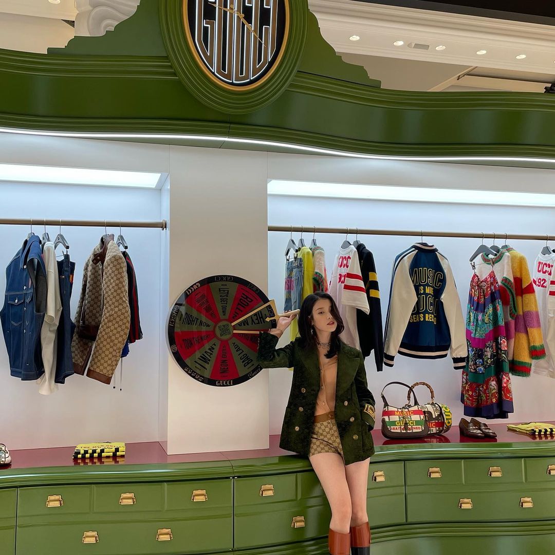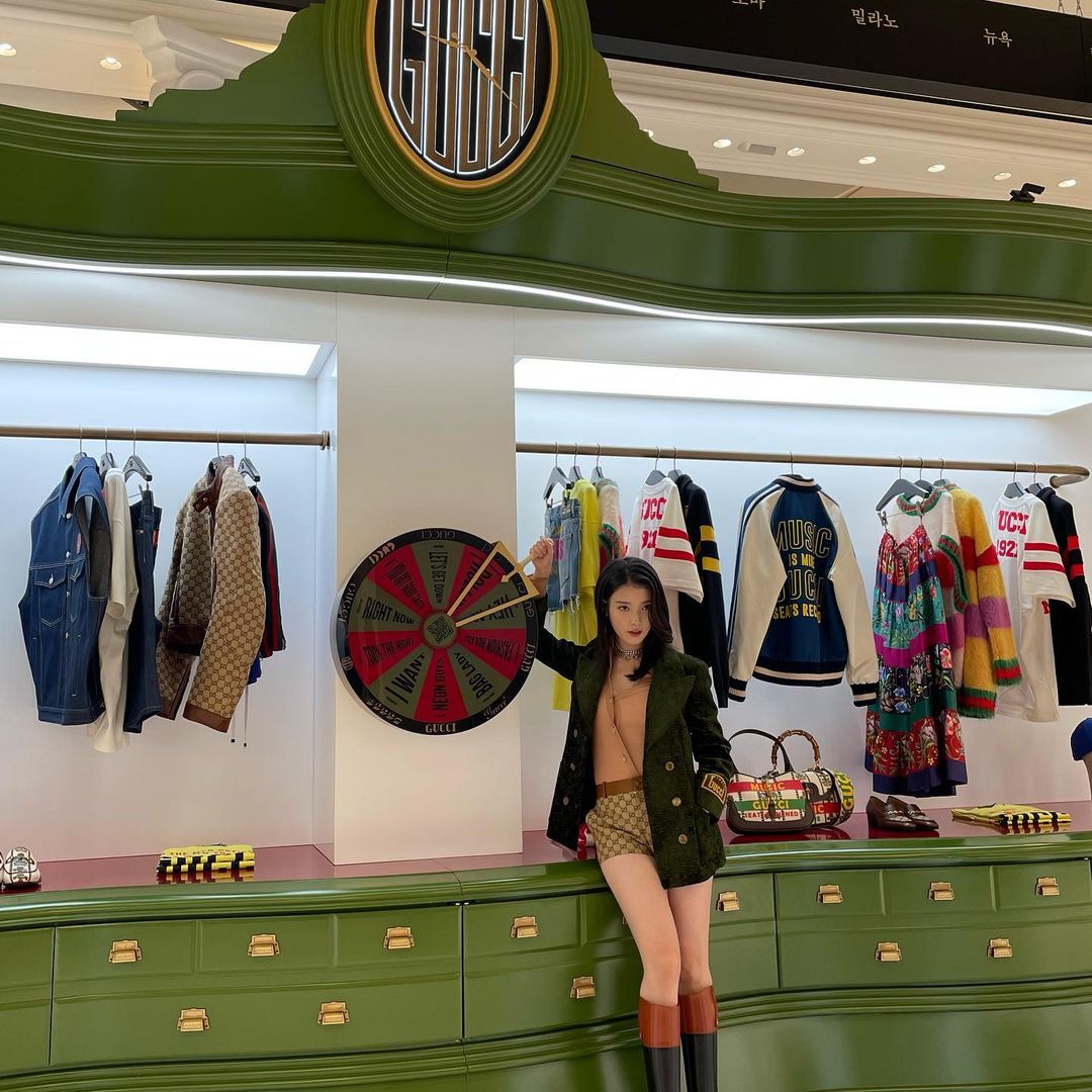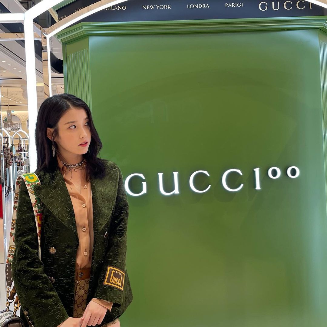 평소 비싼 옷을 잘 입지는 않지만, 구찌 브랜드로 녹색 계열의 패션 맞춤은 아이유의 미모를 돋보이게 해 준다.
